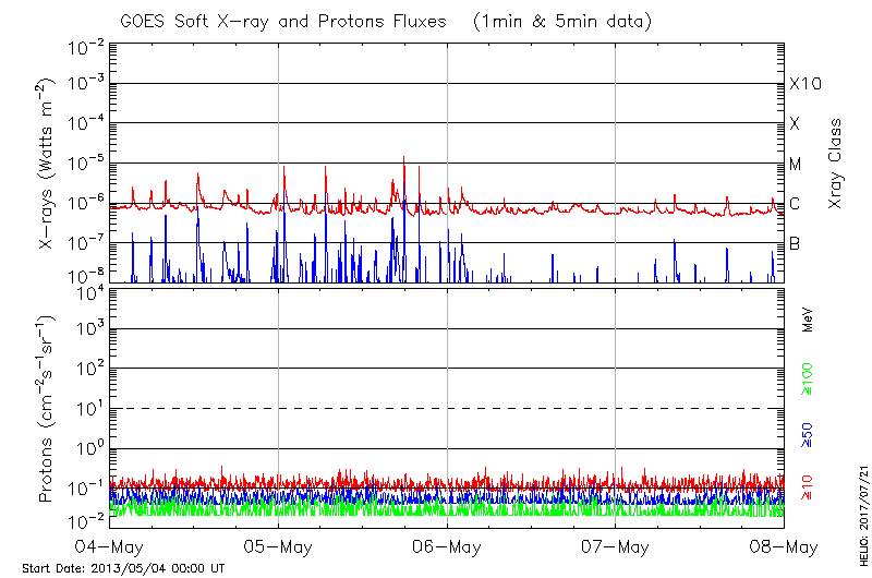 This page provides light-curves generated from GOES soft X-ray and Particle data for the date indicated at the top and the preceding three days.