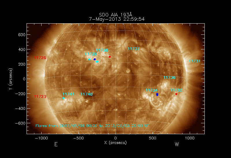 The locations of the flares over-plotted on the image are derived from the flare catalogue