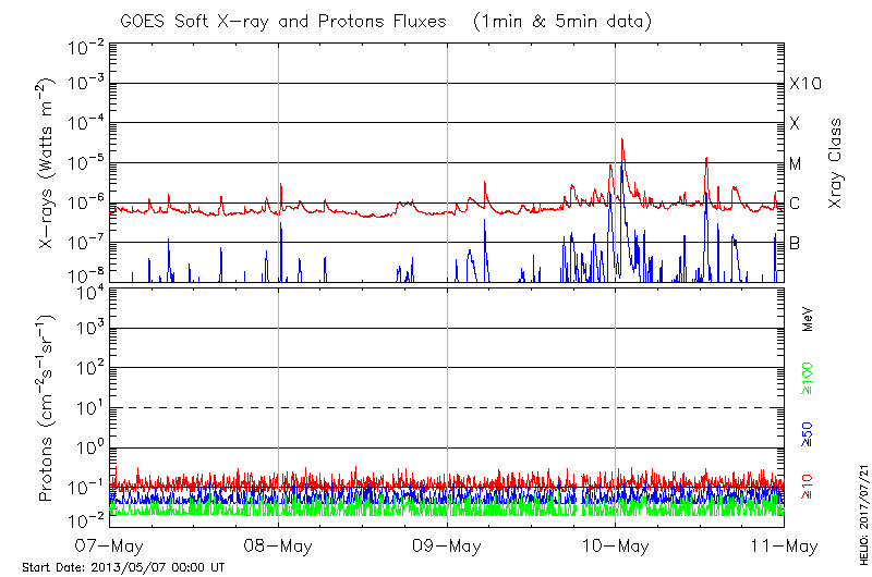 This page provides light-curves generated from GOES soft X-ray and Particle data for the date indicated at the top and the preceding three days.