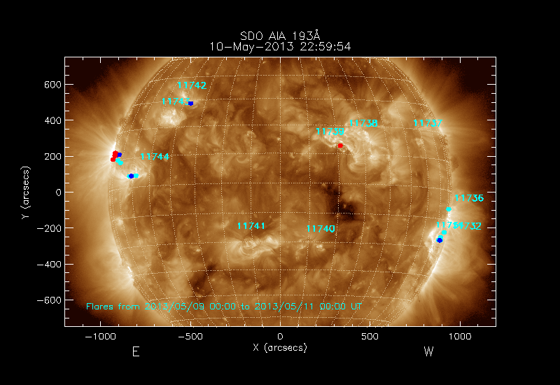 The locations of the flares over-plotted on the image are derived from the flare catalogue