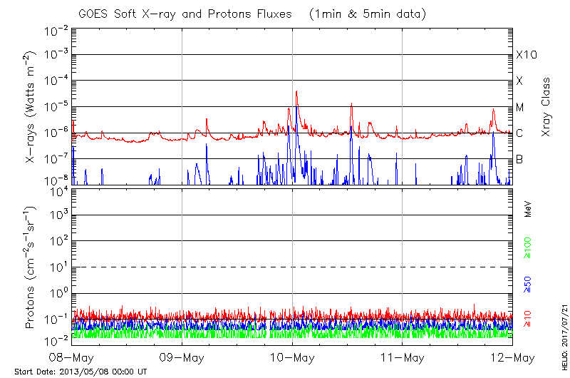 This page provides light-curves generated from GOES soft X-ray and Particle data for the date indicated at the top and the preceding three days.