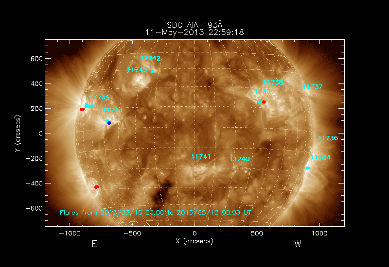 The most recent flares (≤12 hours) are shown as red dots, 12-24 hours ago as blue dots and older ones as turquoise dots.