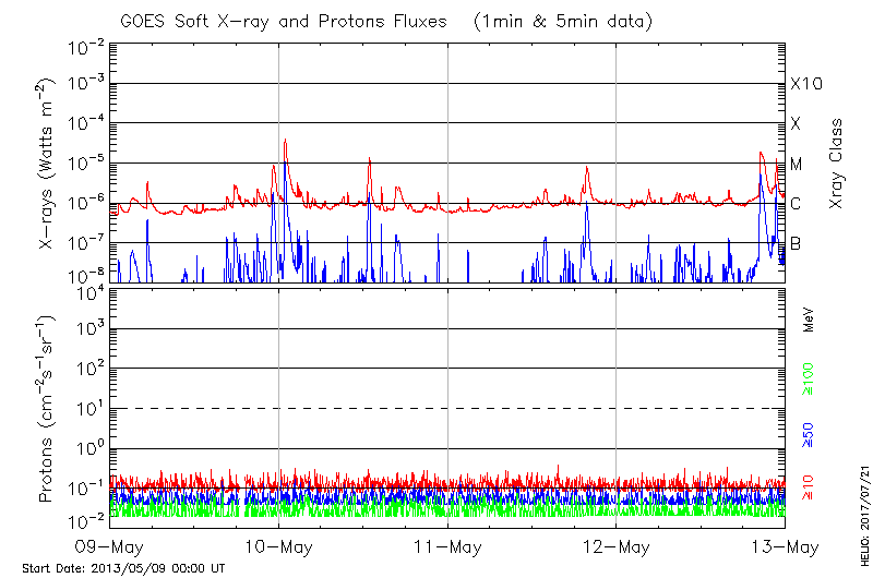 This page provides light-curves generated from GOES soft X-ray and Particle data for the date indicated at the top and the preceding three days.