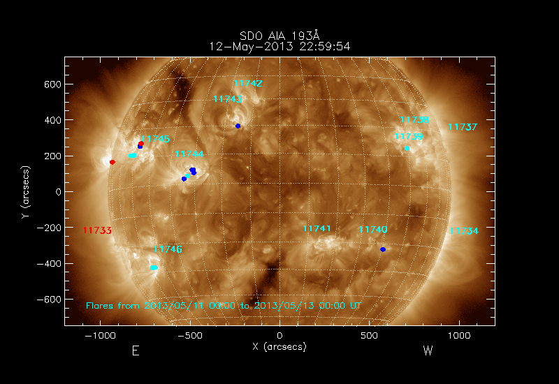 The locations of the flares over-plotted on the image are derived from the flare catalogue