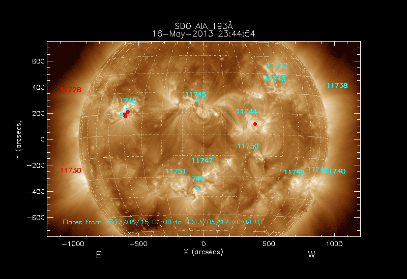 The locations of the flares over-plotted on the image are derived from the flare catalogue