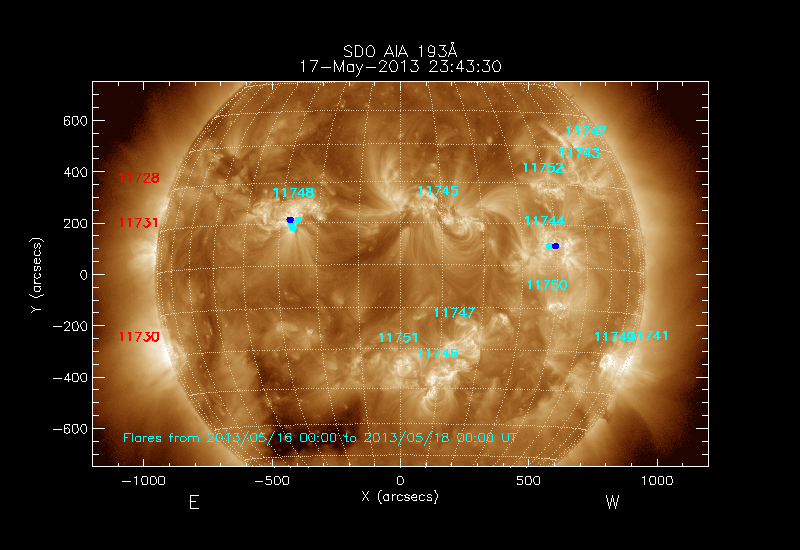The locations of the flares over-plotted on the image are derived from the flare catalogue