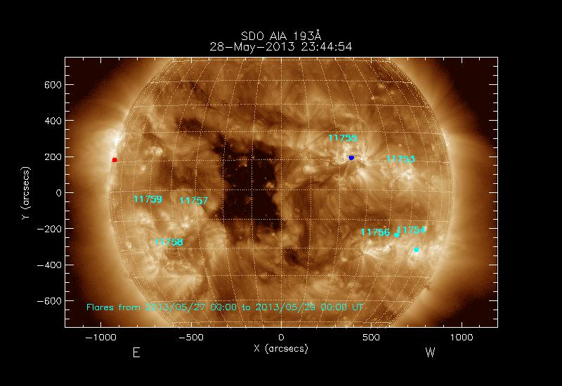 Click on an Active Region plot to display the Region Report including the region evolution and flaring history. HEC Search for NOAA Active Regions (SRS) records for this date and the day before.