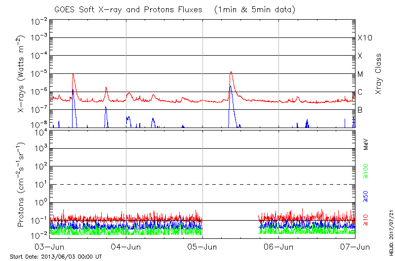 This page provides light-curves generated from GOES soft X-ray and Particle data for the date indicated at the top and the preceding three days.