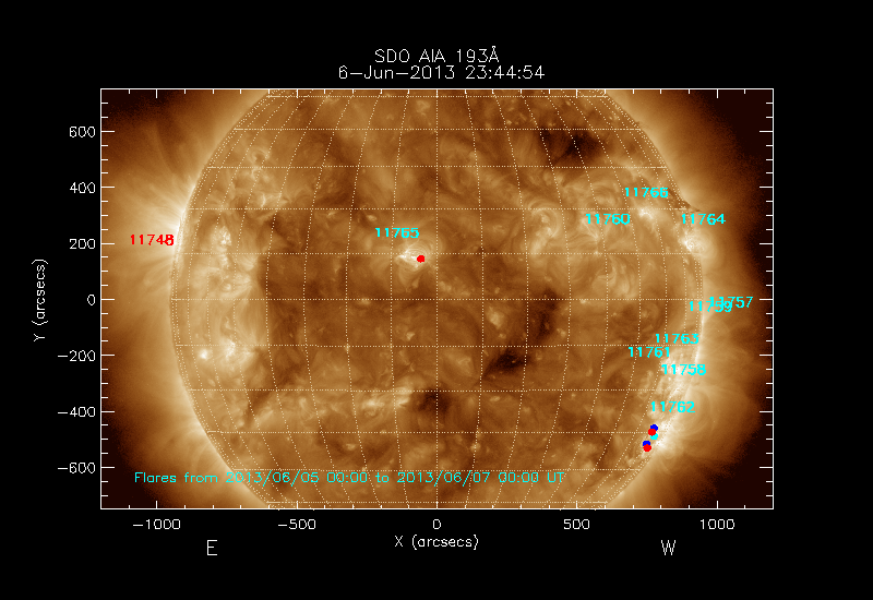 The locations of the flares over-plotted on the image are derived from the flare catalogue