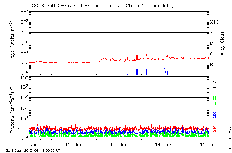 This page provides light-curves generated from GOES soft X-ray and Particle data for the date indicated at the top and the preceding three days.