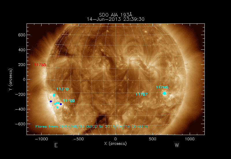 The locations of the flares over-plotted on the image are derived from the flare catalogue