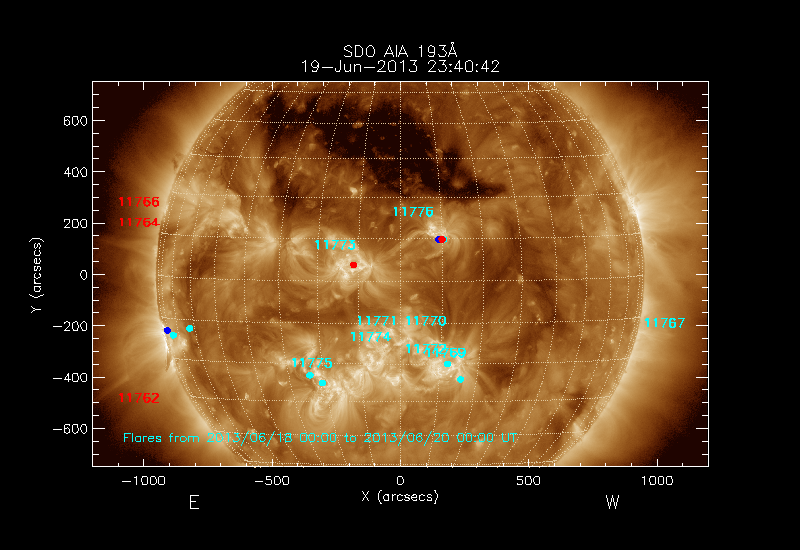 Click on an Active Region plot to display the Region Report including the region evolution and flaring history. HEC Search for NOAA Active Regions (SRS) records for this date and the day before.