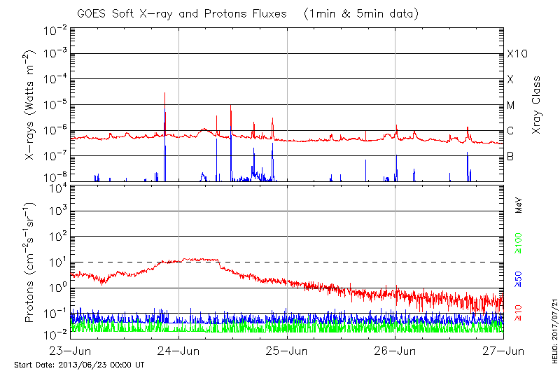 This page provides light-curves generated from GOES soft X-ray and Particle data for the date indicated at the top and the preceding three days.