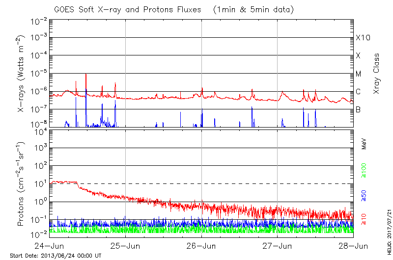 This page provides light-curves generated from GOES soft X-ray and Particle data for the date indicated at the top and the preceding three days.