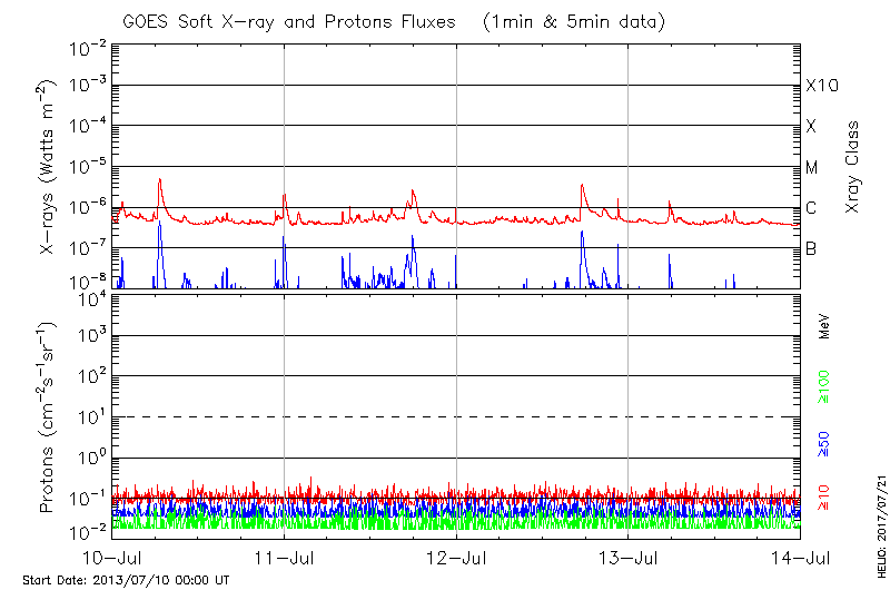 This page provides light-curves generated from GOES soft X-ray and Particle data for the date indicated at the top and the preceding three days.