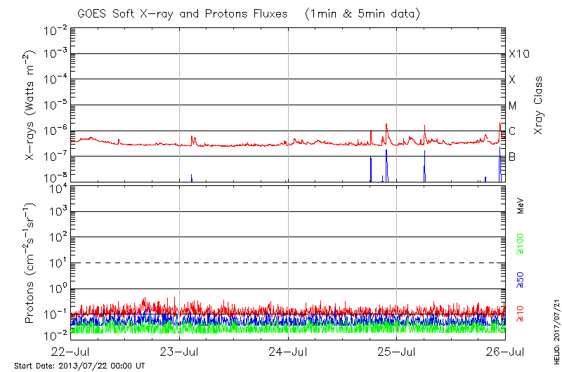 This page provides light-curves generated from GOES soft X-ray and Particle data for the date indicated at the top and the preceding three days.