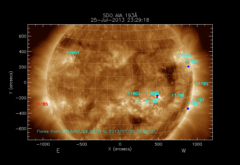 Click on an Active Region plot to display the Region Report including the region evolution and flaring history. HEC Search for NOAA Active Regions (SRS) records for this date and the day before.