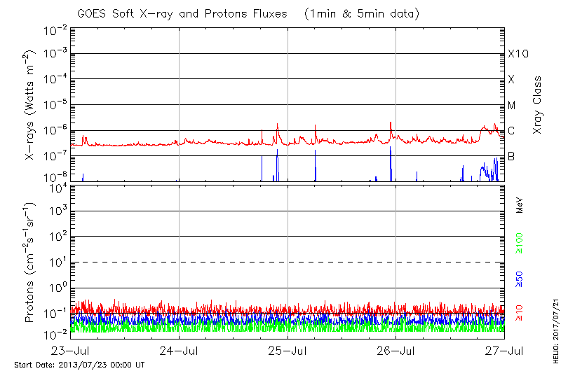 This page provides light-curves generated from GOES soft X-ray and Particle data for the date indicated at the top and the preceding three days.