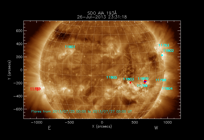 Click on an Active Region plot to display the Region Report including the region evolution and flaring history. HEC Search for NOAA Active Regions (SRS) records for this date and the day before.