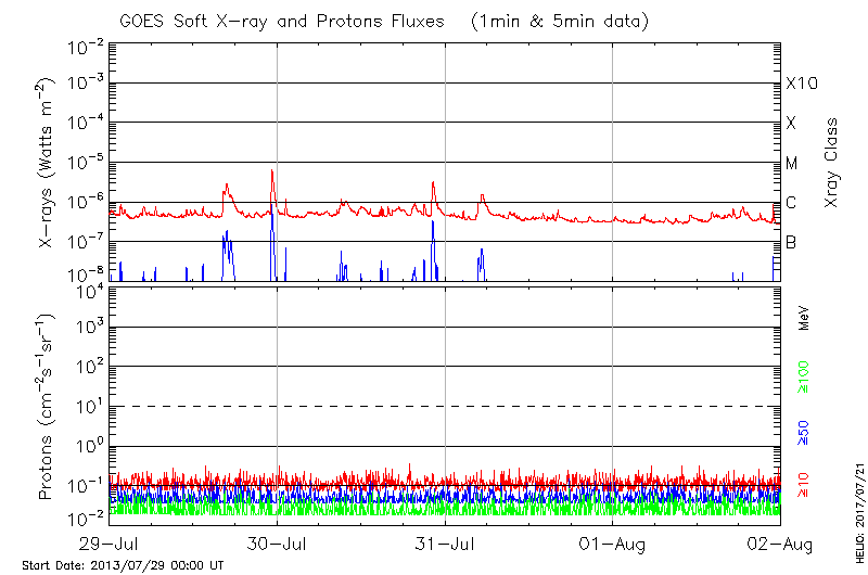 This page provides light-curves generated from GOES soft X-ray and Particle data for the date indicated at the top and the preceding three days.