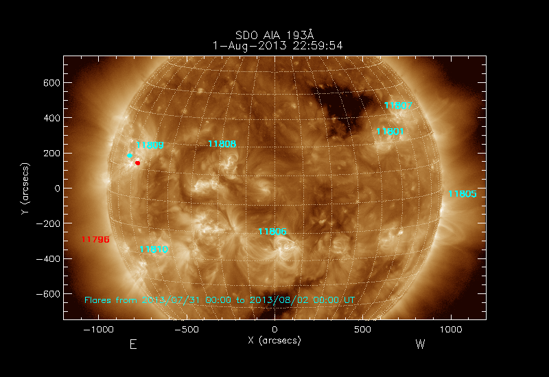The locations of the flares over-plotted on the image are derived from the flare catalogue