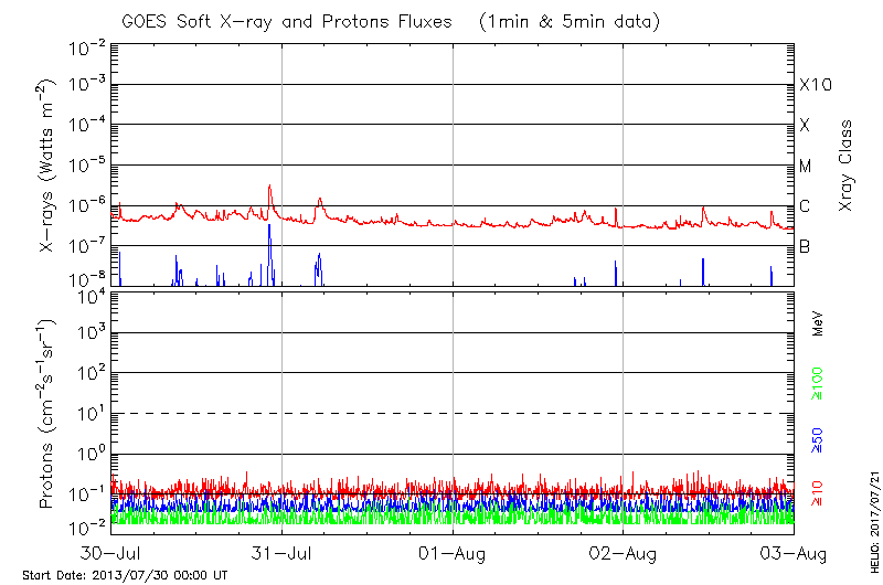 This page provides light-curves generated from GOES soft X-ray and Particle data for the date indicated at the top and the preceding three days.