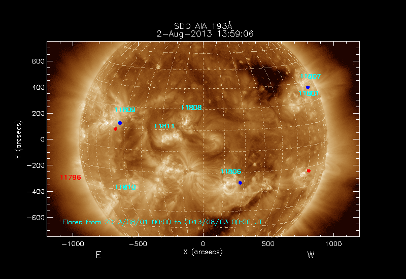 All soft X-ray flares (≥A1.0) where the location has been determined are shown; the flare locations are rotated to the time of the image