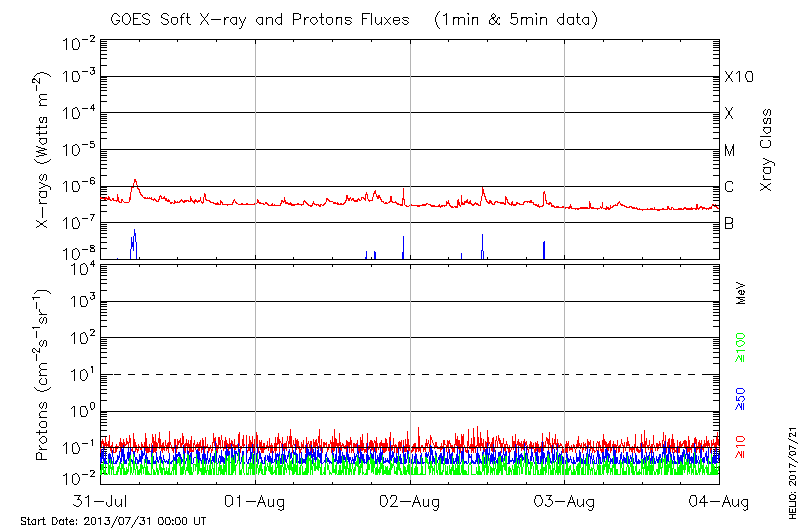 This page provides light-curves generated from GOES soft X-ray and Particle data for the date indicated at the top and the preceding three days.
