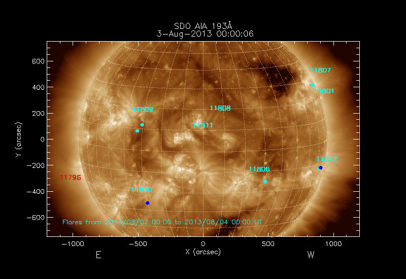 All soft X-ray flares (≥A1.0) where the location has been determined are shown; the flare locations are rotated to the time of the image