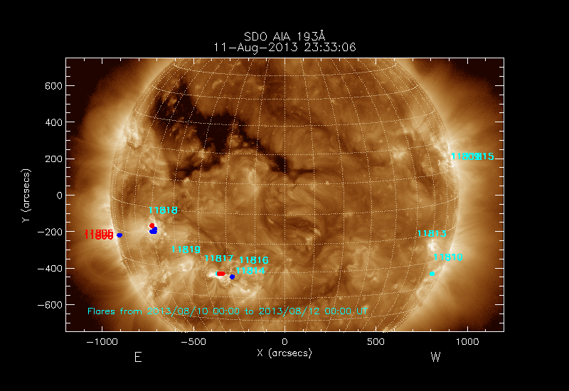 All soft X-ray flares (≥A1.0) where the location has been determined are shown; the flare locations are rotated to the time of the image
