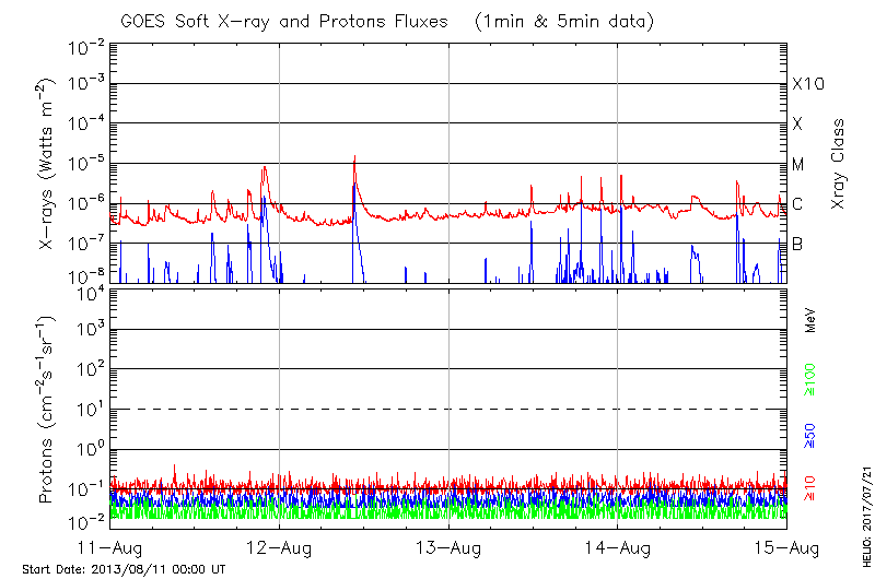 This page provides light-curves generated from GOES soft X-ray and Particle data for the date indicated at the top and the preceding three days.