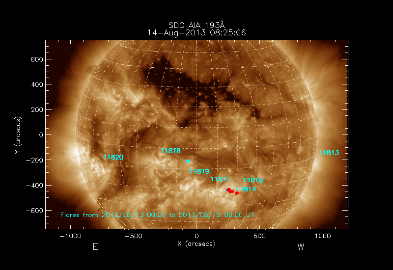 those in red (on the left hand side of the image) indicate where old Active Regions that could be returning.