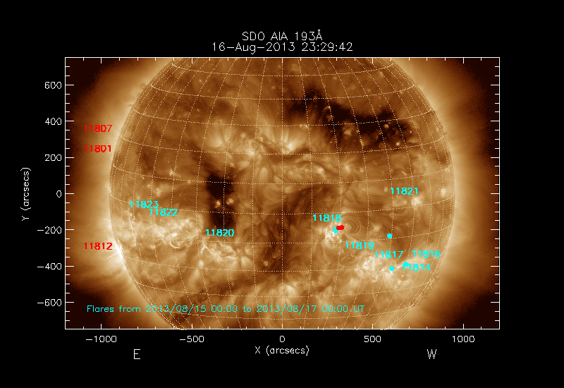 Click on an Active Region plot to display the Region Report including the region evolution and flaring history. HEC Search for NOAA Active Regions (SRS) records for this date and the day before.