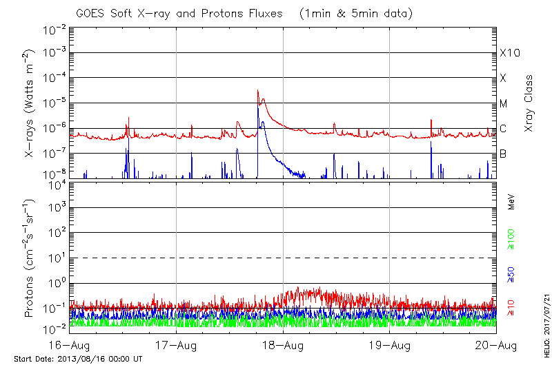 This page provides light-curves generated from GOES soft X-ray and Particle data for the date indicated at the top and the preceding three days.