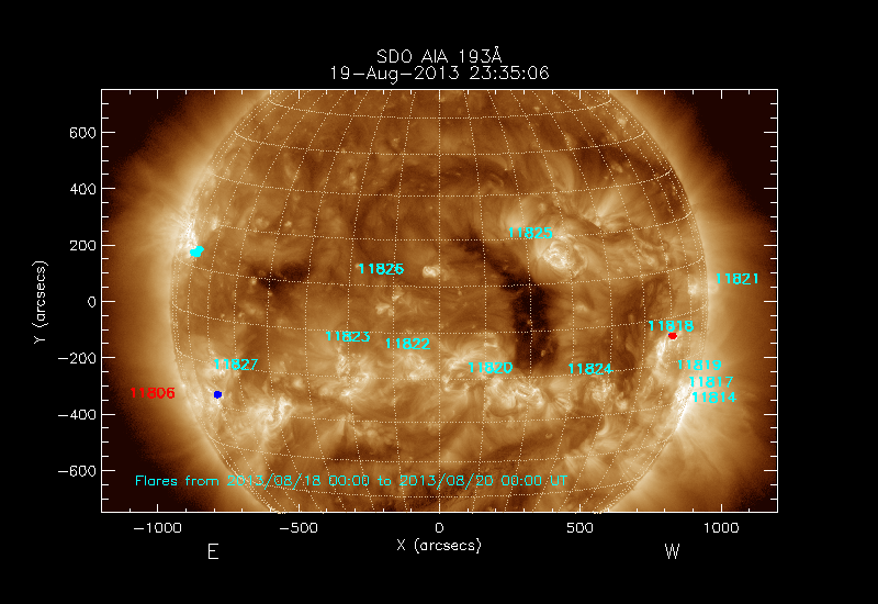 those in red (on the left hand side of the image) indicate where old Active Regions that could be returning.