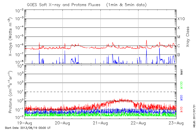 This page provides light-curves generated from GOES soft X-ray and Particle data for the date indicated at the top and the preceding three days.