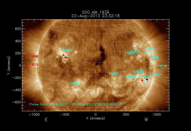 those in red (on the left hand side of the image) indicate where old Active Regions that could be returning.