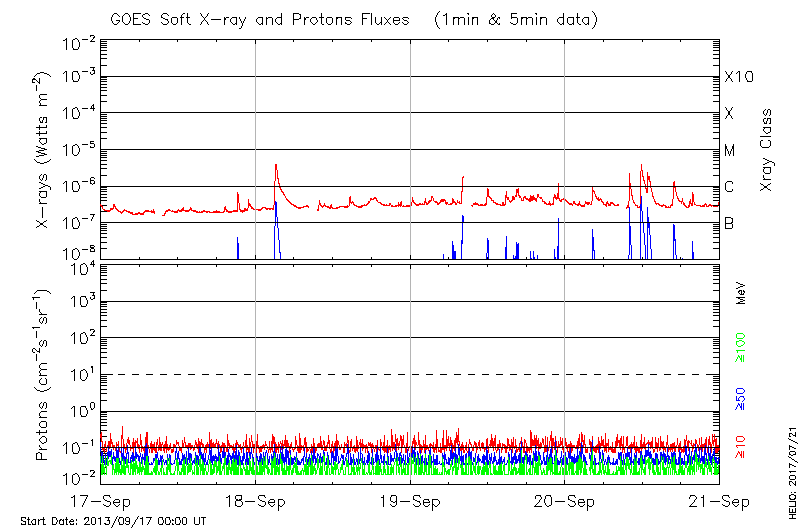 This page provides light-curves generated from GOES soft X-ray and Particle data for the date indicated at the top and the preceding three days.
