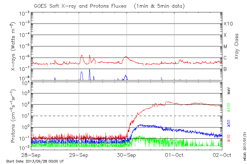 This page provides light-curves generated from GOES soft X-ray and Particle data for the date indicated at the top and the preceding three days.