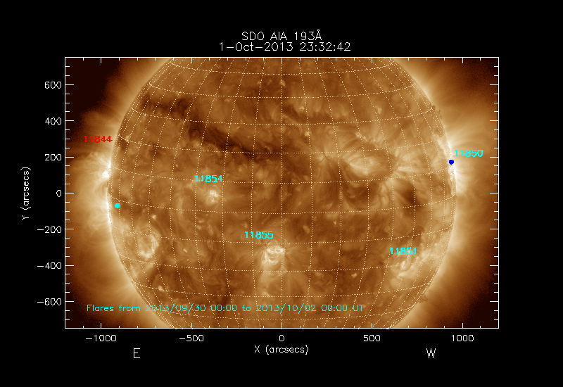 All soft X-ray flares (≥A1.0) where the location has been determined are shown; the flare locations are rotated to the time of the image