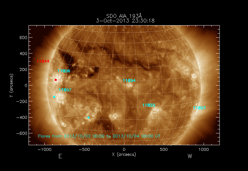 The locations of the flares over-plotted on the image are derived from the flare catalogue
