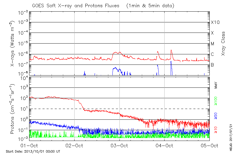 This page provides light-curves generated from GOES soft X-ray and Particle data for the date indicated at the top and the preceding three days.