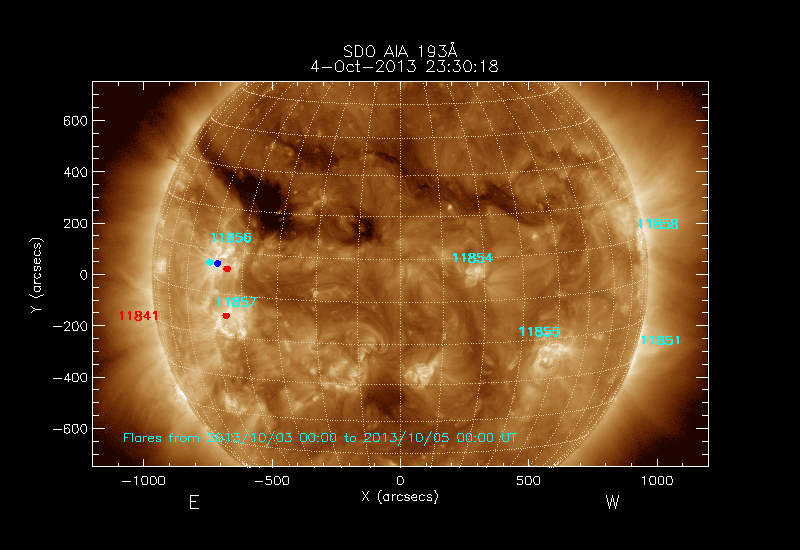 dots and 24-48 hours as turquoise dots; the flare locations are rotated to the time of the image.