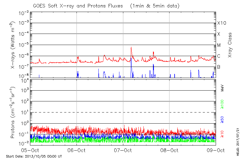 This page provides light-curves generated from GOES soft X-ray and Particle data for the date indicated at the top and the preceding three days.