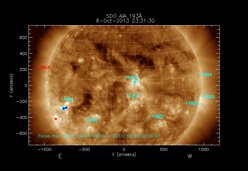 All soft X-ray flares (≥A1.0) where the location has been determined are shown; the flare locations are rotated to the time of the image