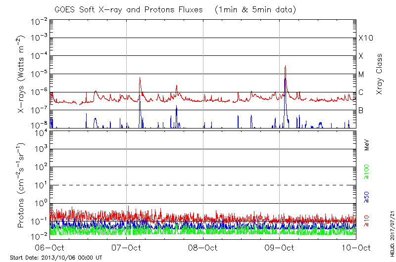 This page provides light-curves generated from GOES soft X-ray and Particle data for the date indicated at the top and the preceding three days.