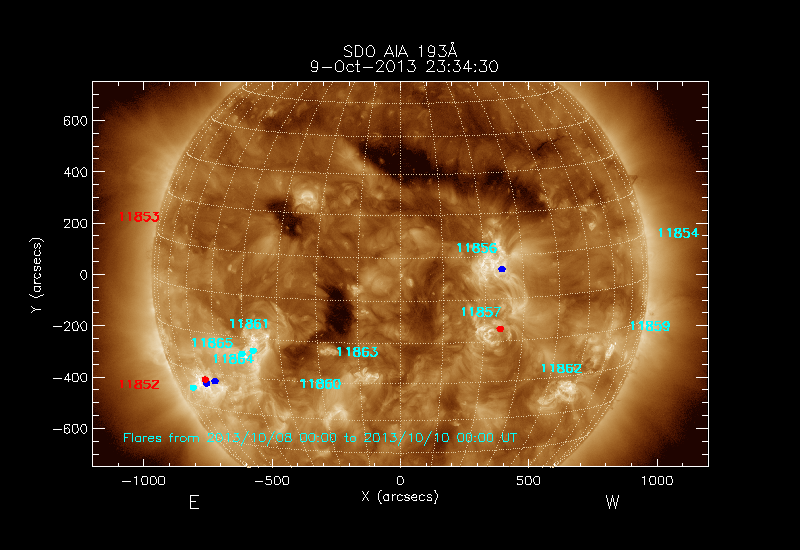 dots and 24-48 hours as turquoise dots; the flare locations are rotated to the time of the image.