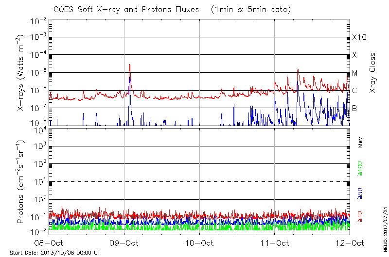 This page provides light-curves generated from GOES soft X-ray and Particle data for the date indicated at the top and the preceding three days.