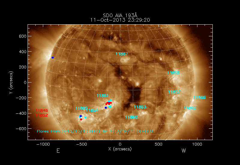 All soft X-ray flares (≥A1.0) where the location has been determined are shown; the flare locations are rotated to the time of the image