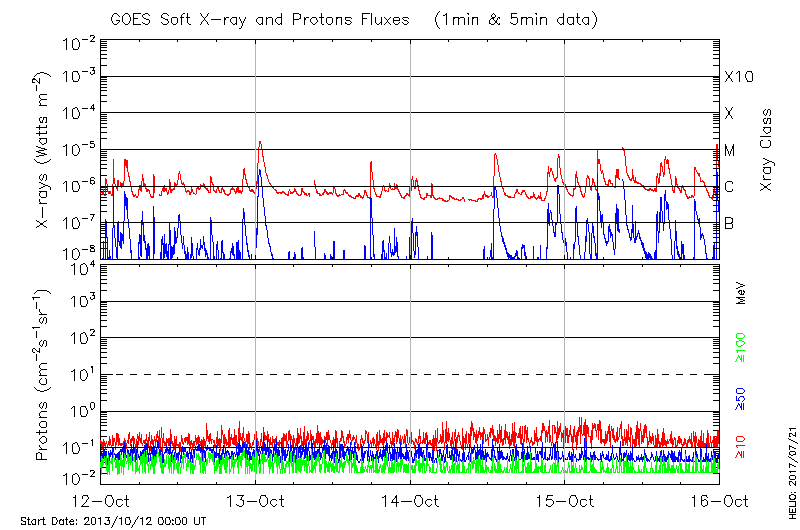 This page provides light-curves generated from GOES soft X-ray and Particle data for the date indicated at the top and the preceding three days.